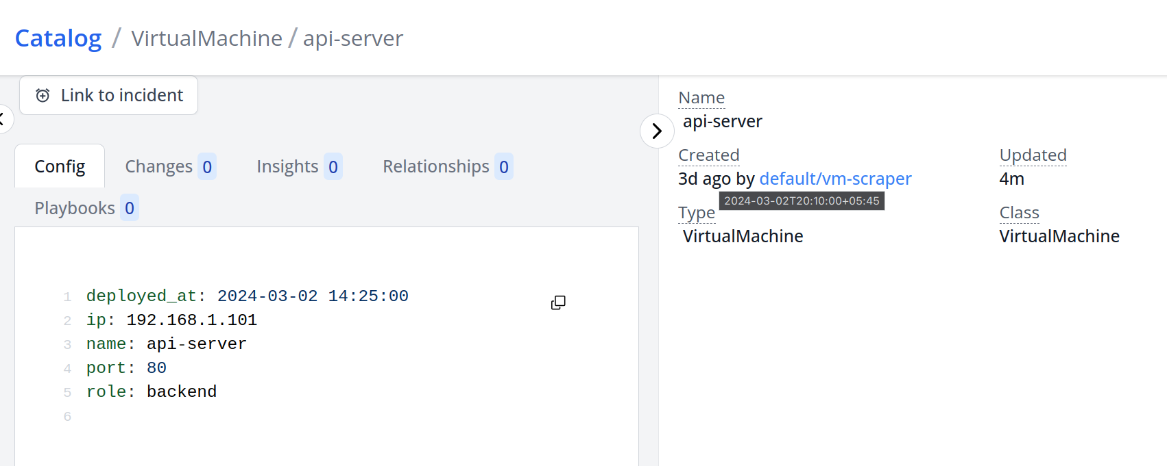 The createFields in the above scrape config instructs config-db to first look at the installed_on field to get the creation date of the config and then try the deployed_at field if it's empty. Specifying the timestampFormat is important because the timestamps in the VM configuration are not in the expected default format.