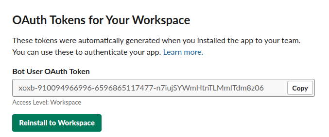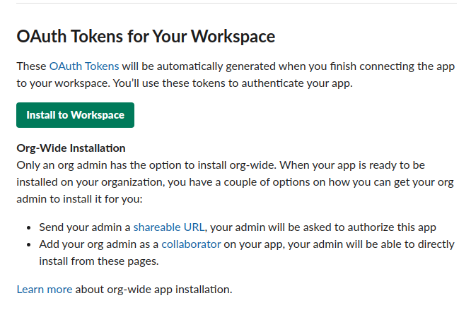 While still on the same page, scroll up to the "OAuth Tokens for Your Workspace" section. Install the newly created app on your Slack workspace.