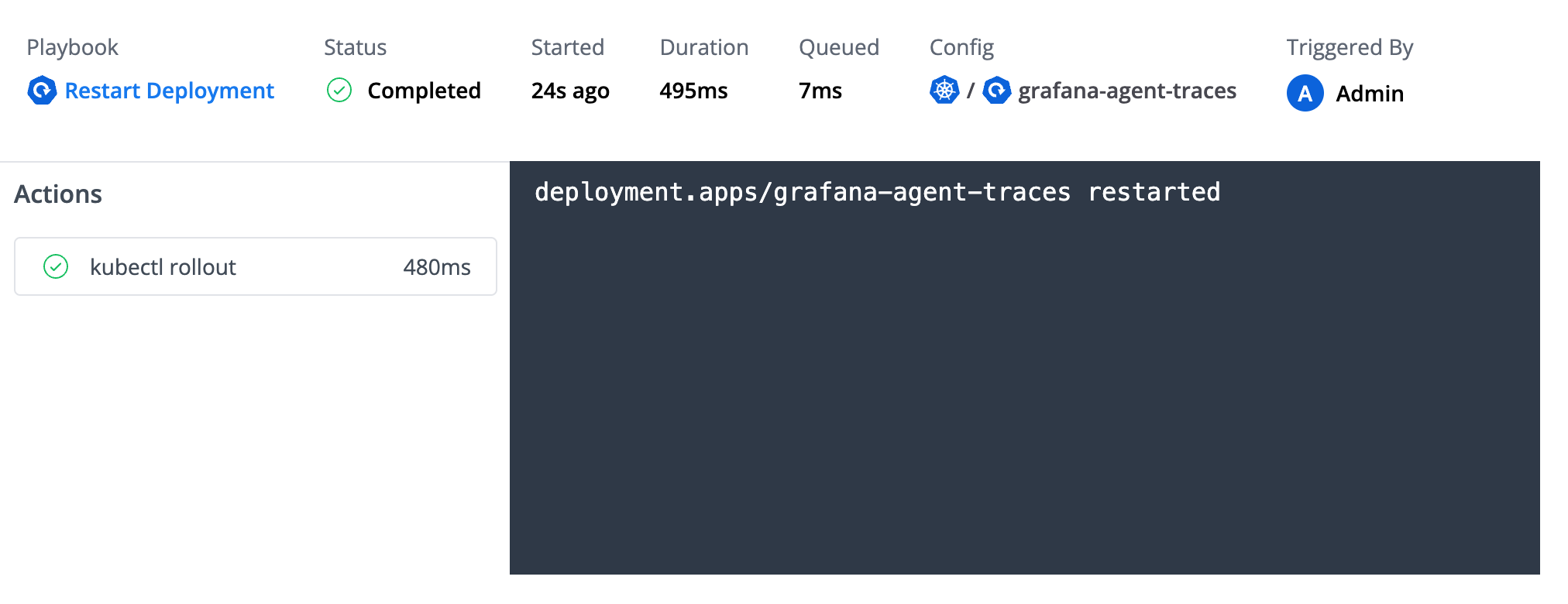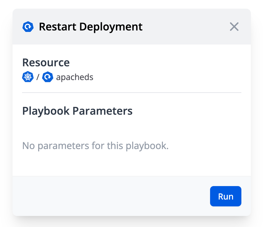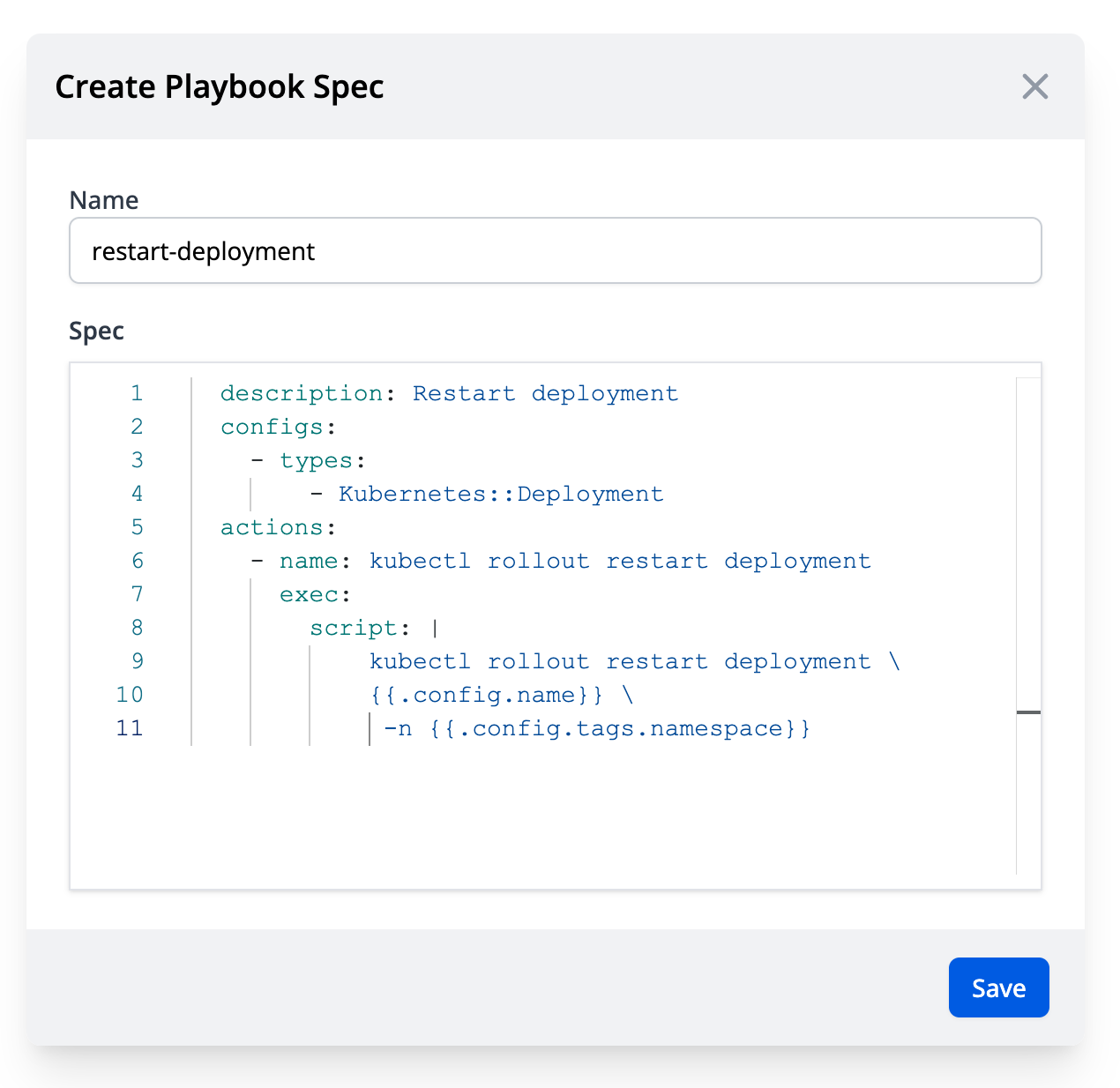 script: kubectl rollout restart deployment {{.config.name}} -n {{.config.tags.namespace}}See Playbook for the full specification.